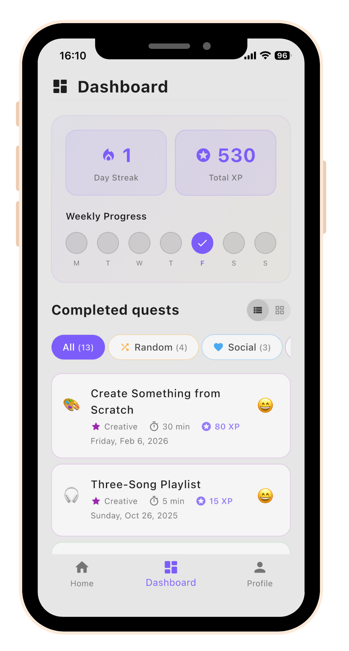 See your mood, progress, and personal wins — all in one place. XP, streaks, and completed quests visualized beautifully.